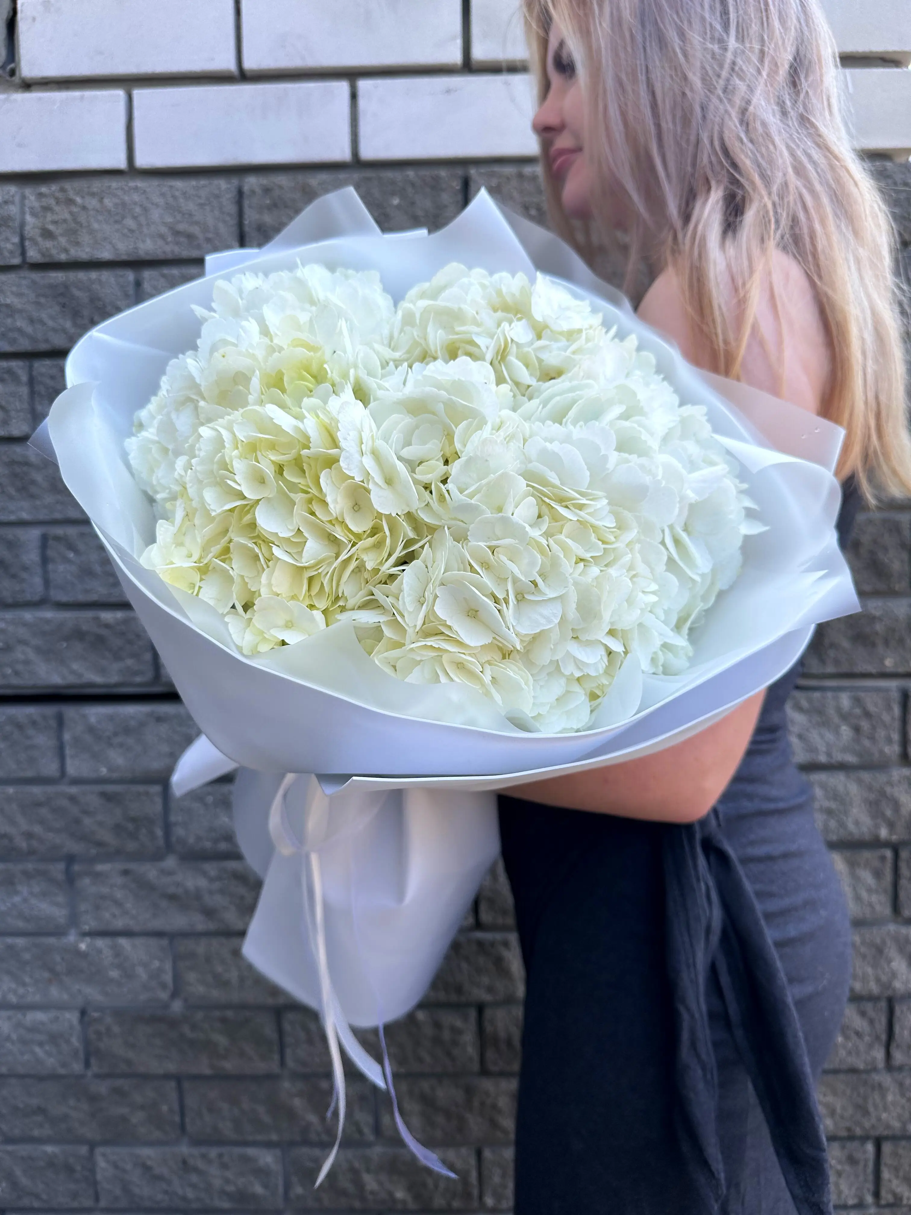 Букет живых цветов из 5 белых гортензий оформленный в дизайнерскую упаковку