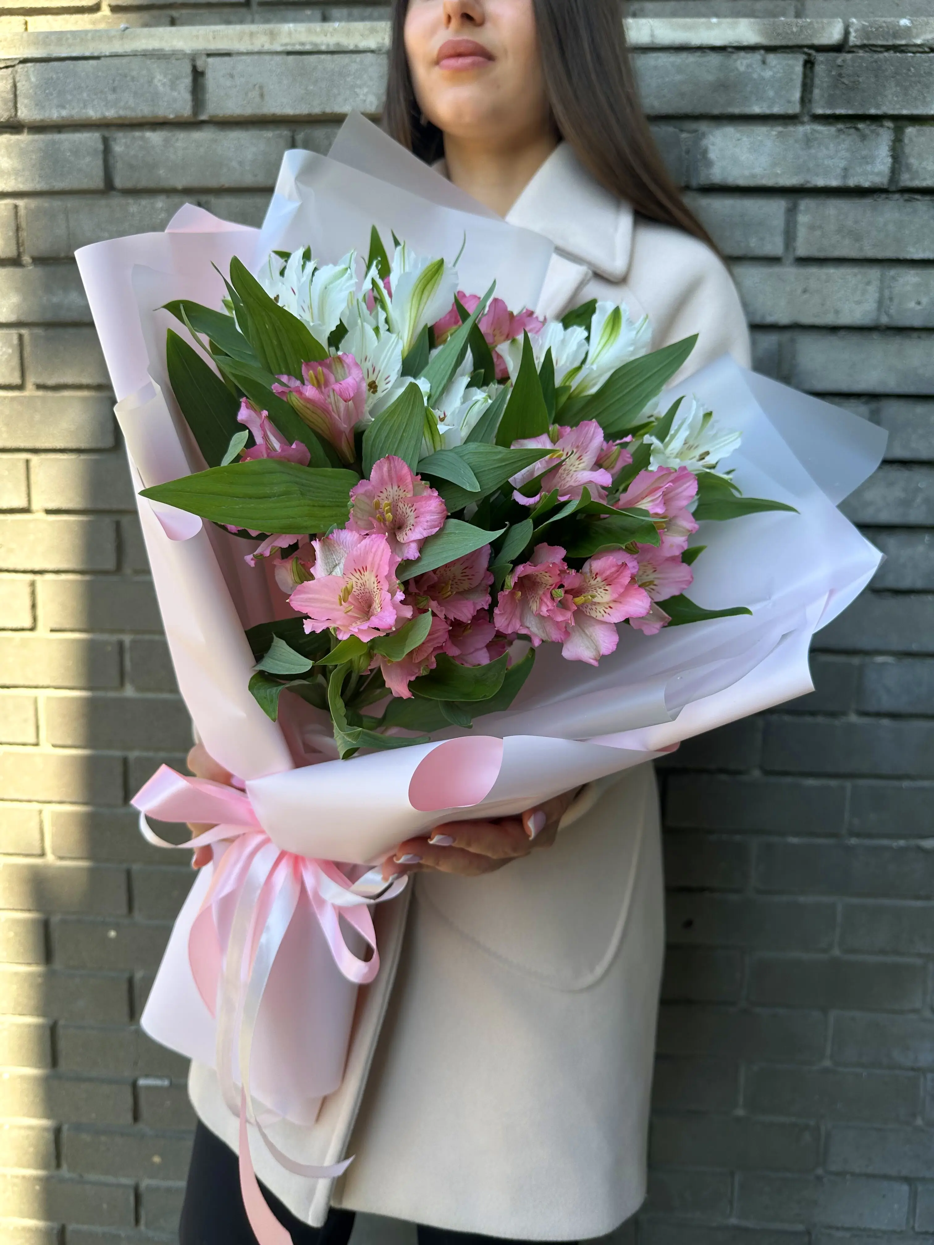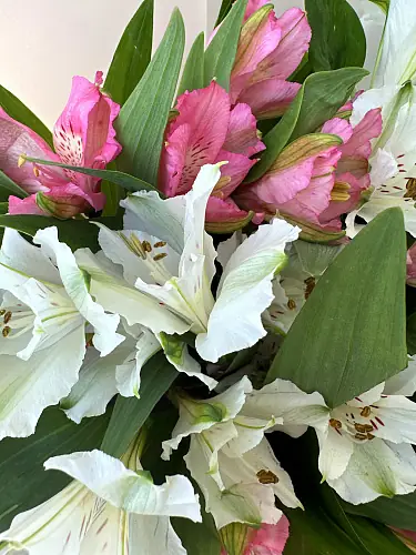 Букет живых цветов из белой и розовой альстромерии в дизайнерской упаковке