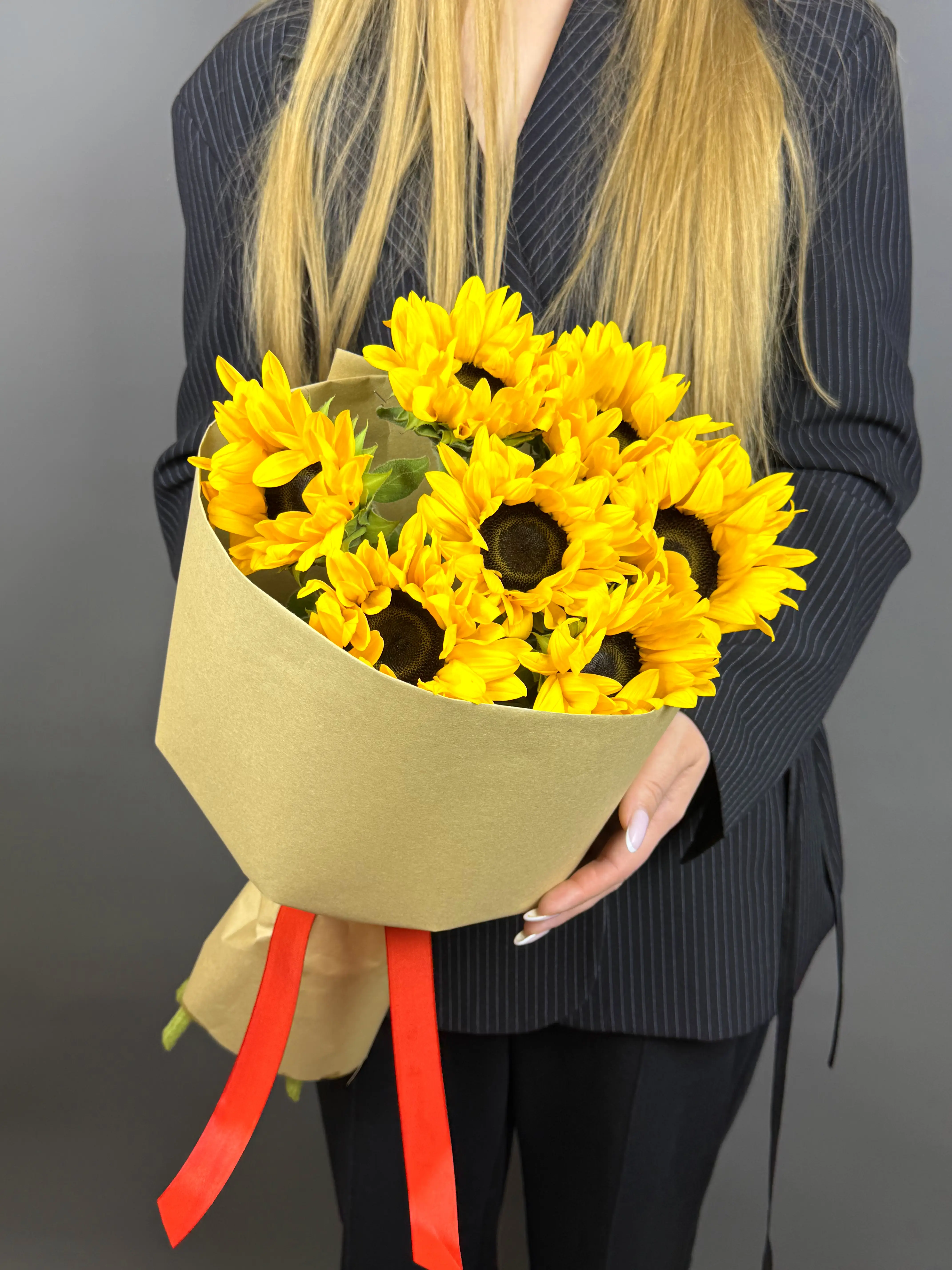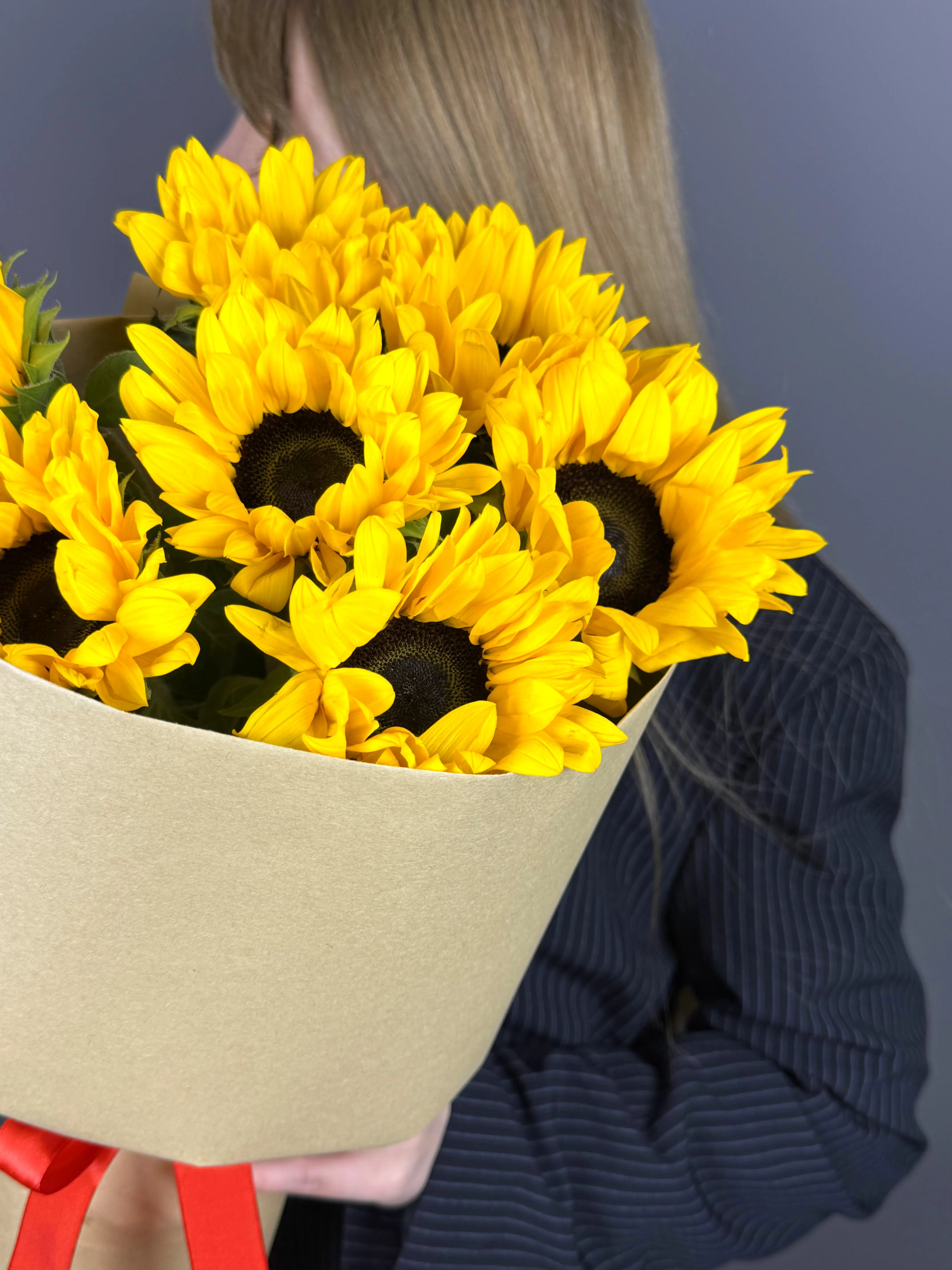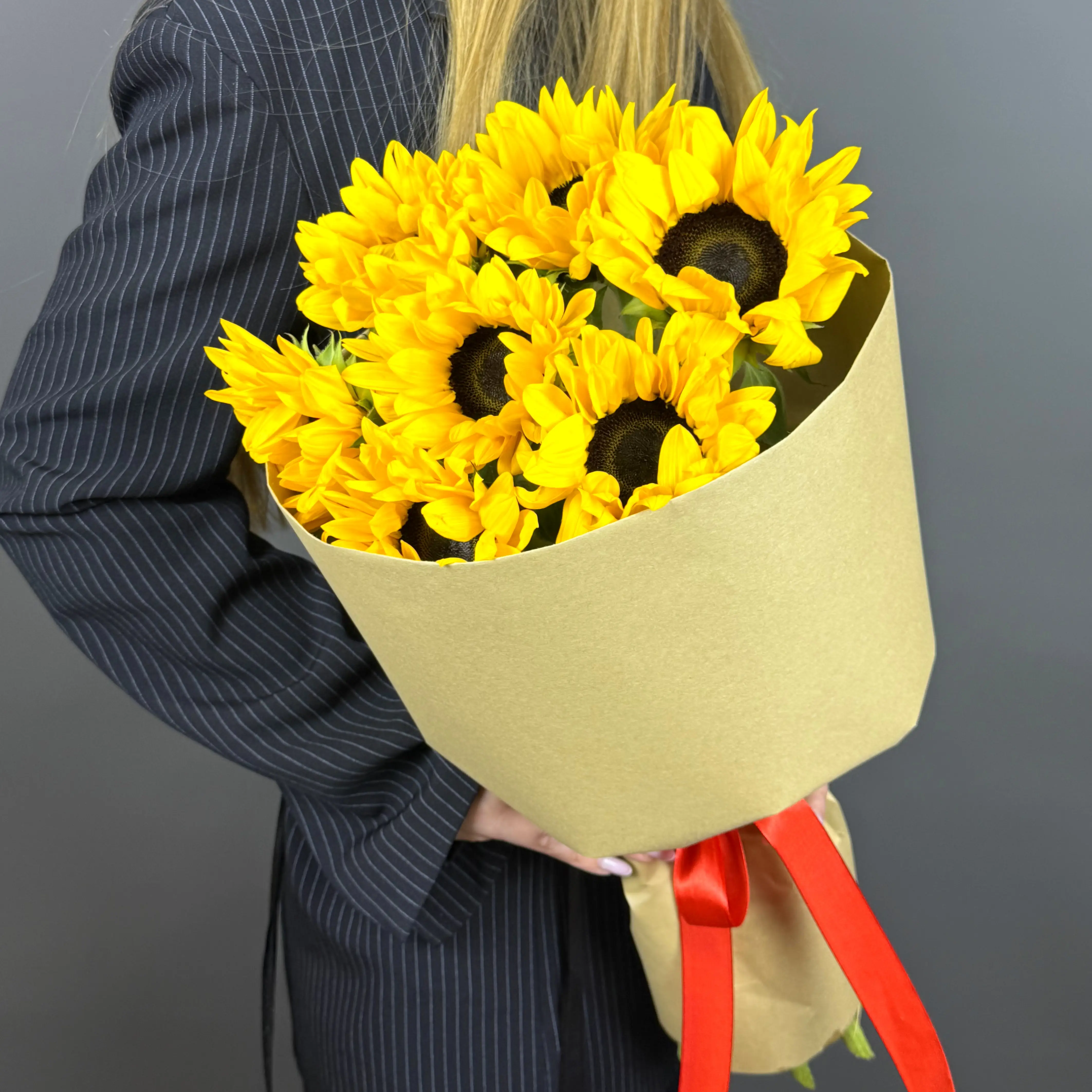 Букеты живых цветов "Солнечный" из подсолнухов в дизайнерской упаковке