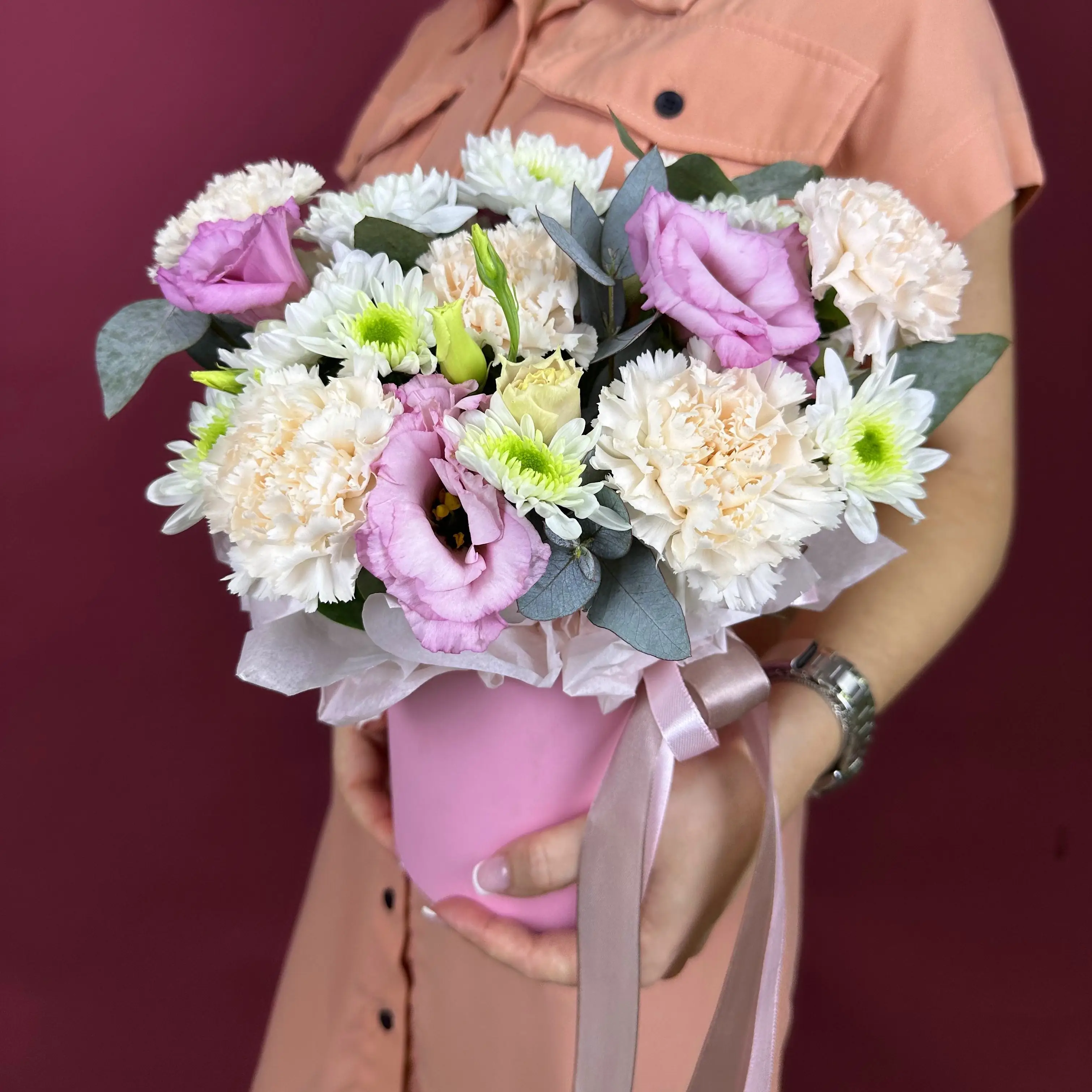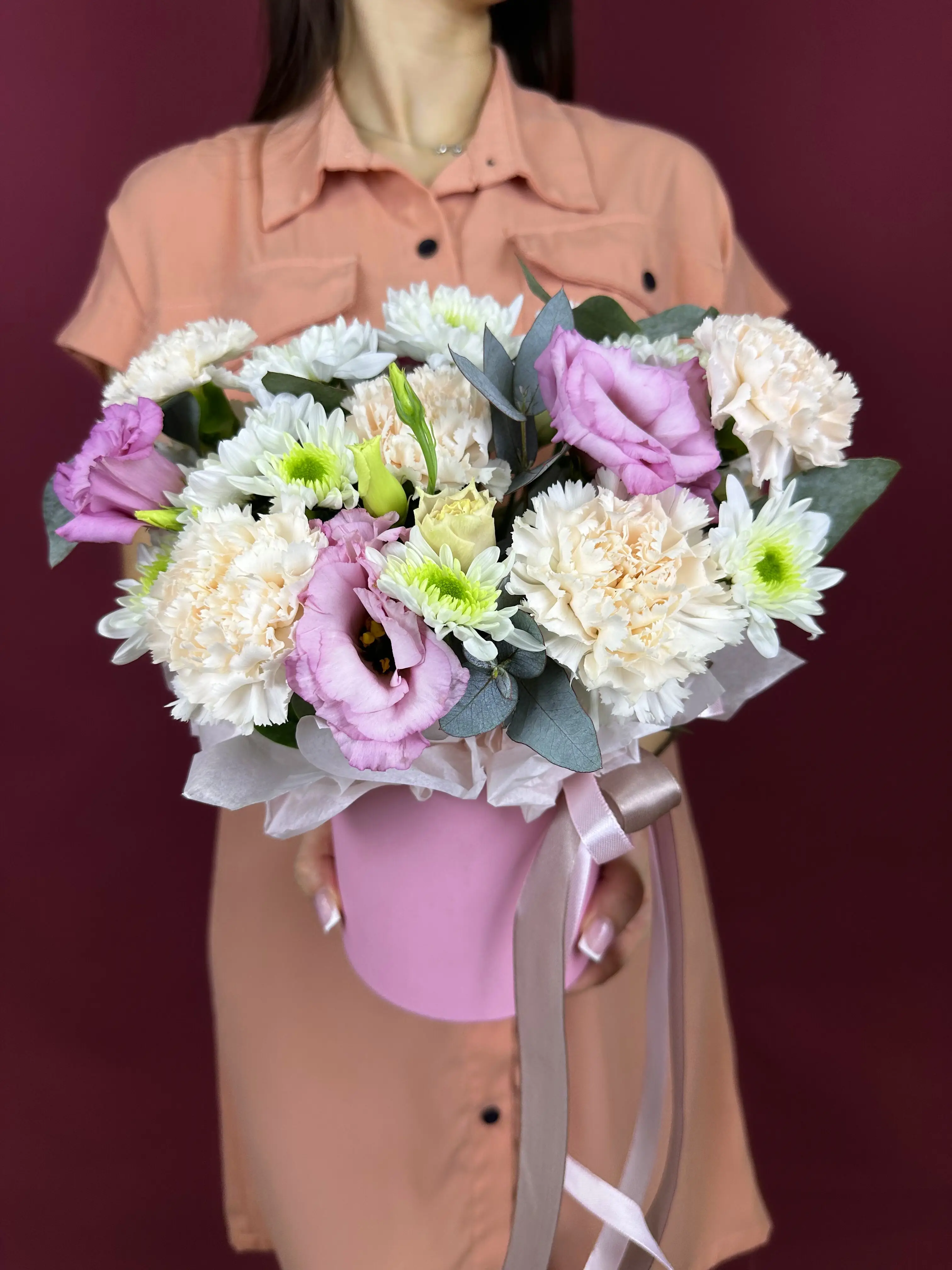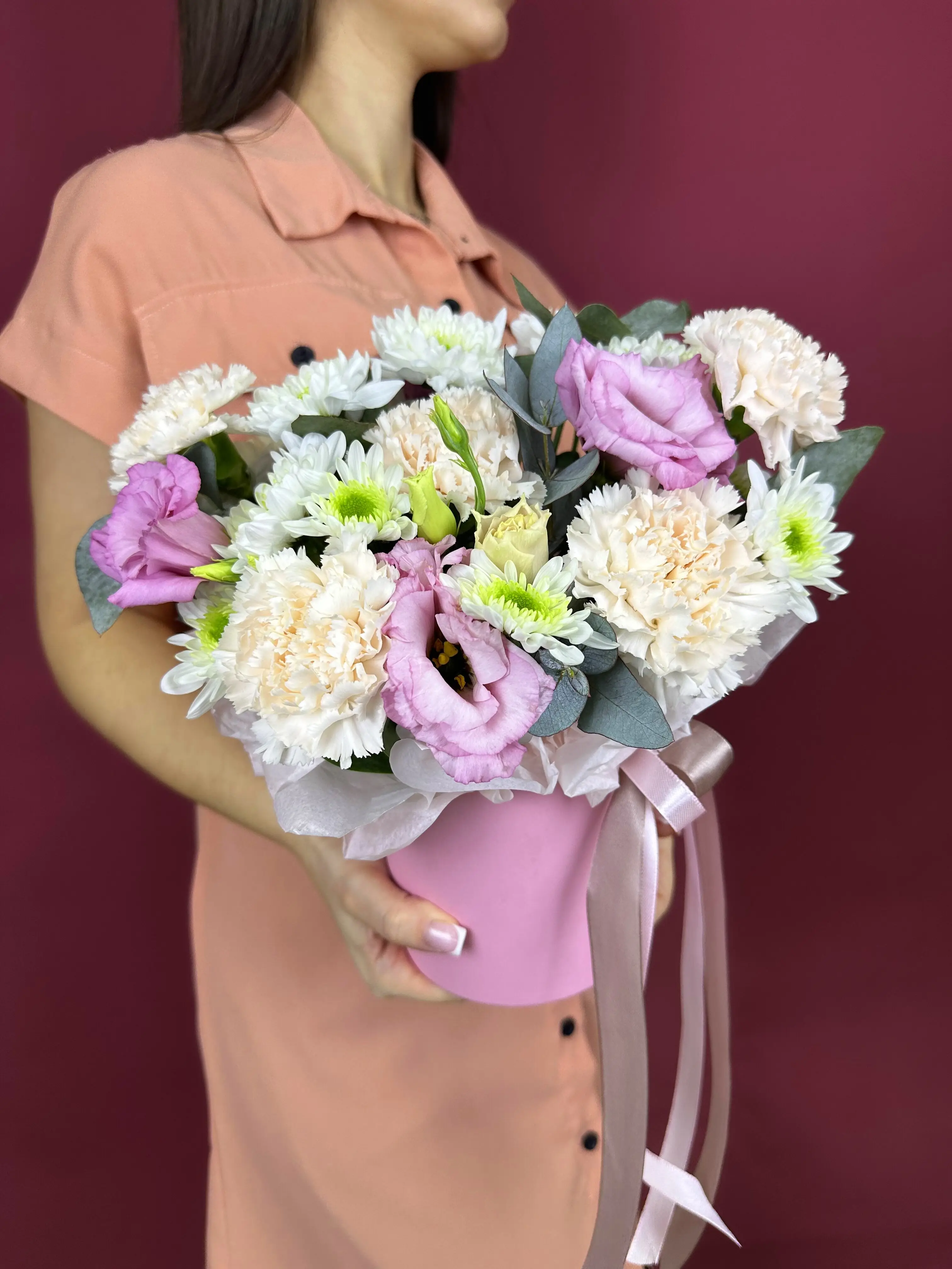 Букет живых цветов с гвоздикой и розовой эустомой в нежной шляпной коробке