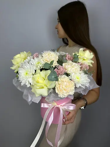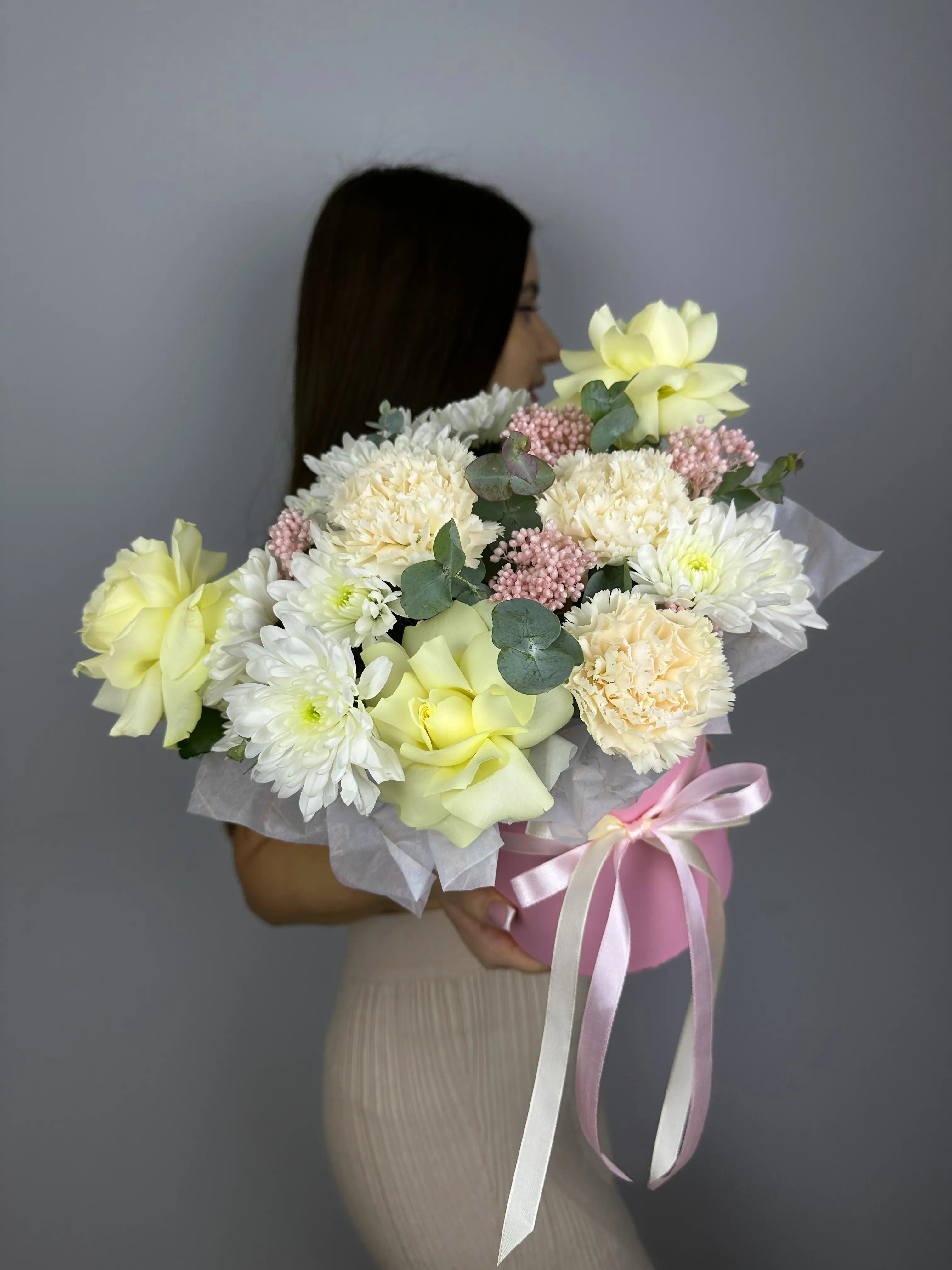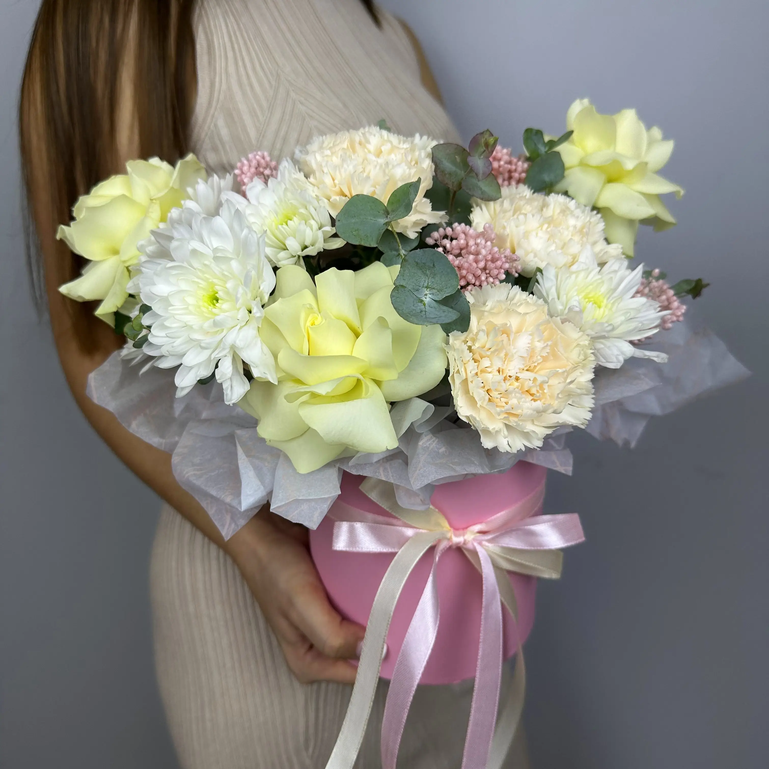 Букет живых цветов с хризантемой и белой французской розой в шляпной коробке