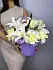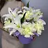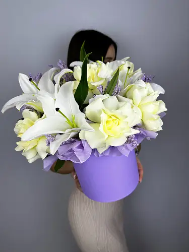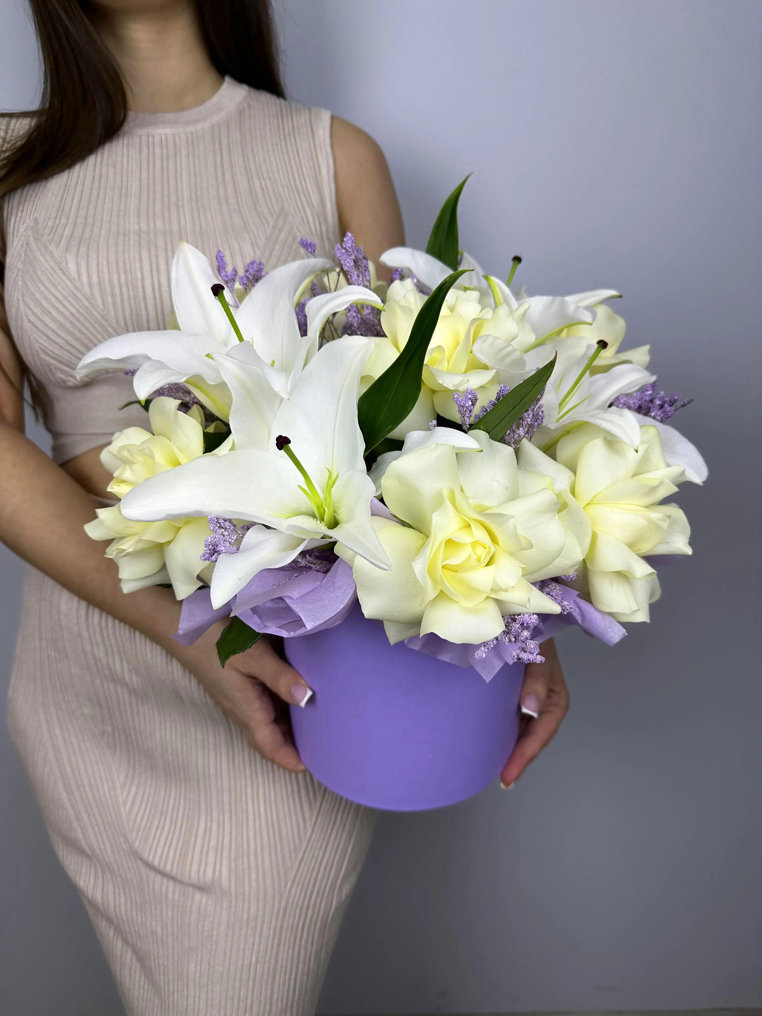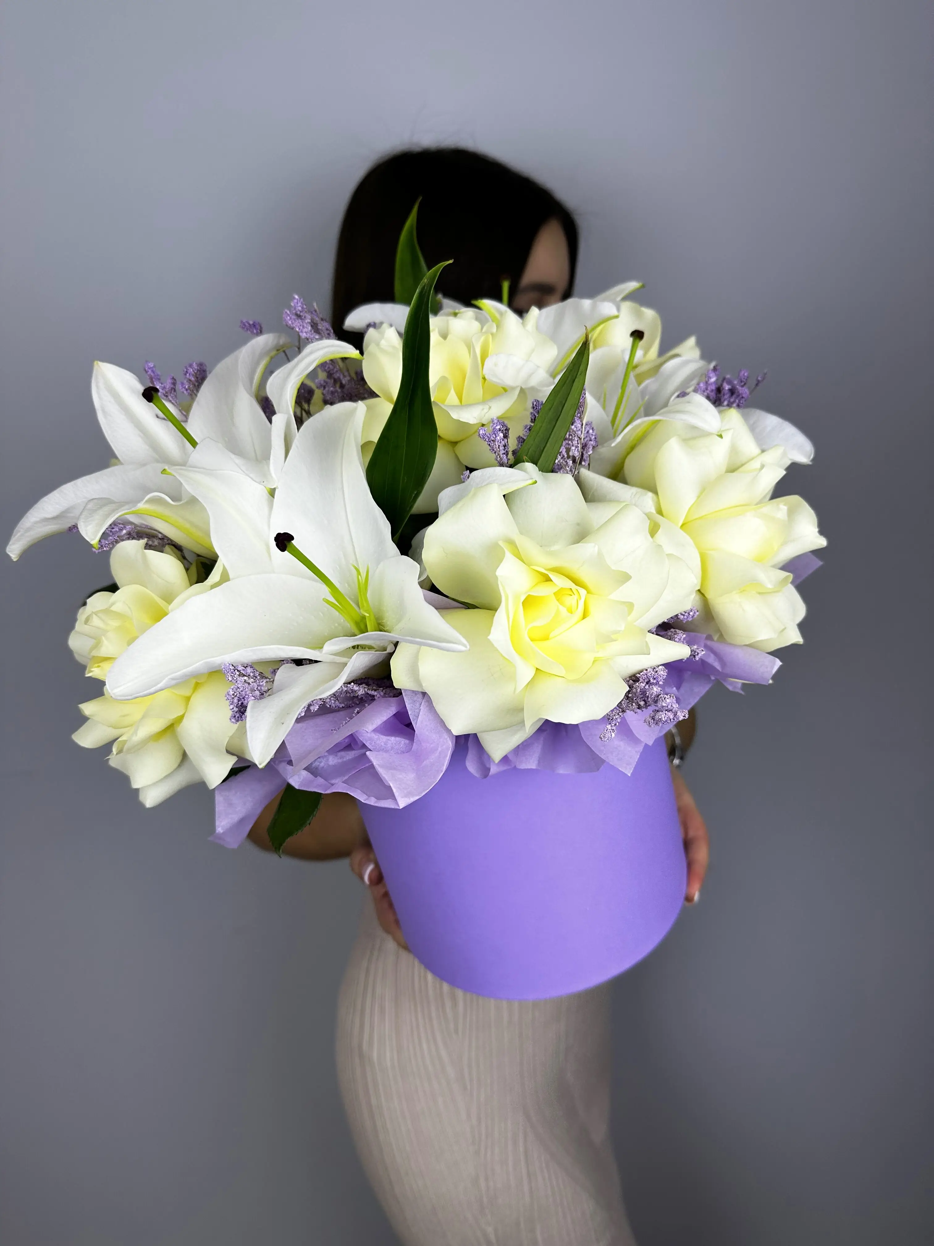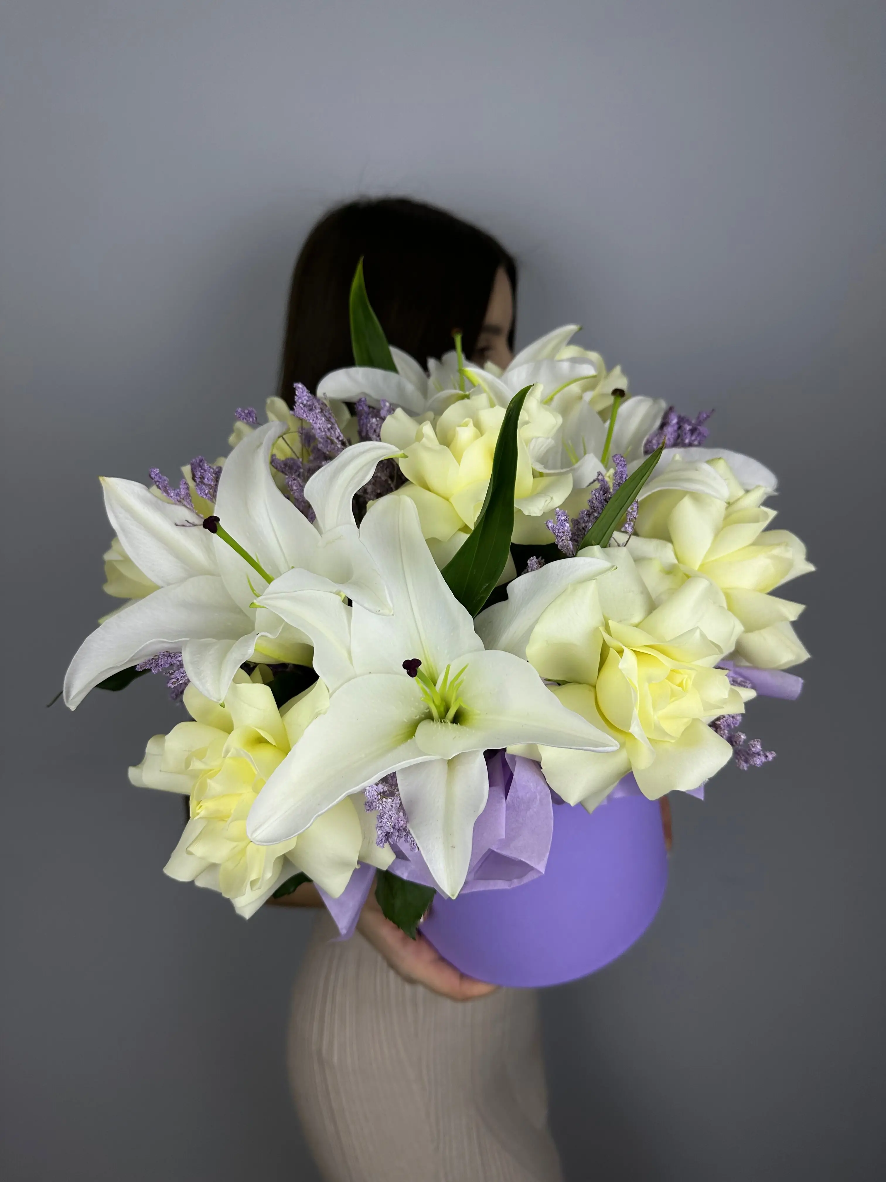 Букет живых цветов с лилией и французскими розами в шляпной коробке