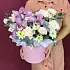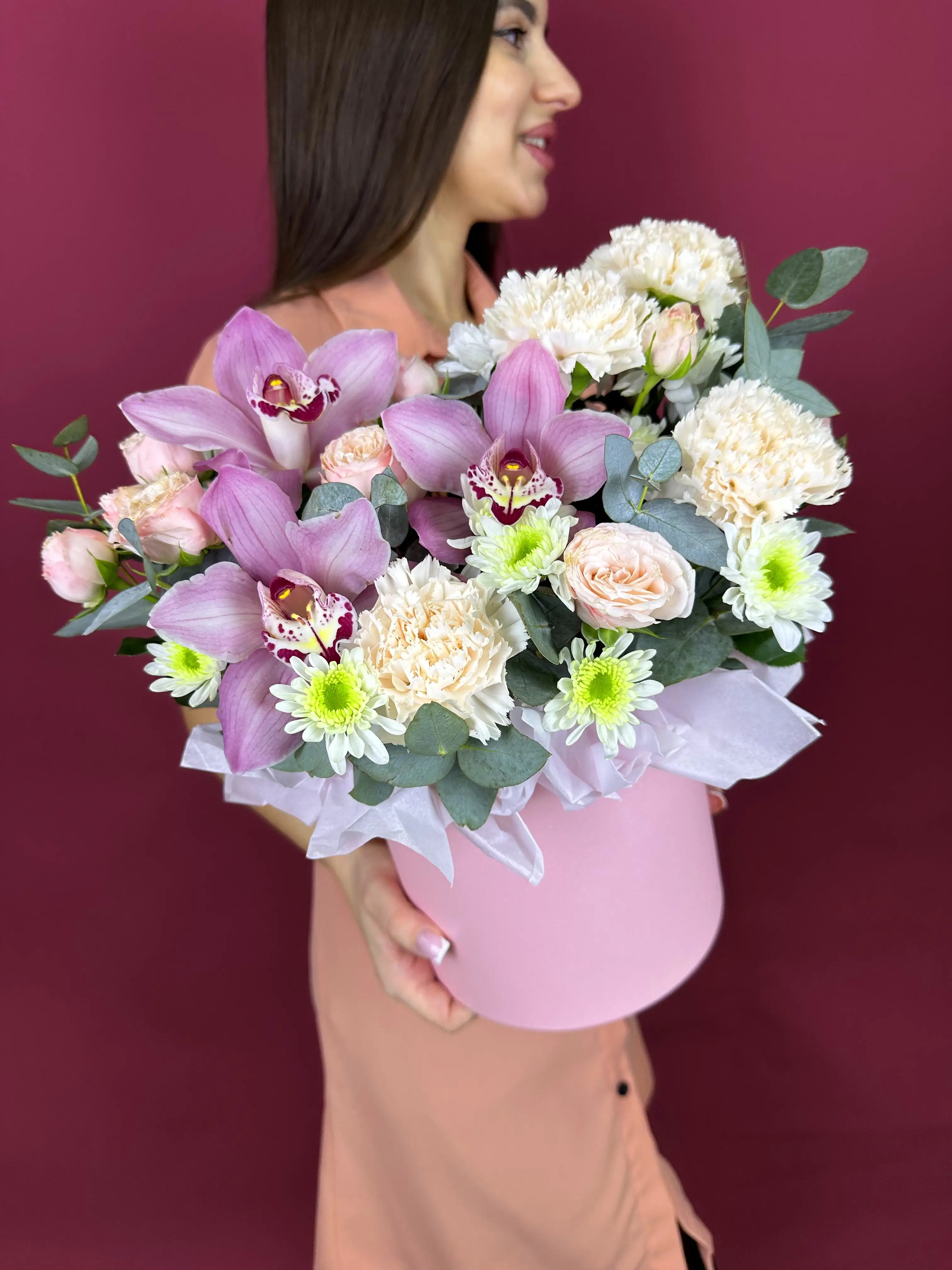 Букет живых цветов с орхидеями и нежными розами в шляпной коробке