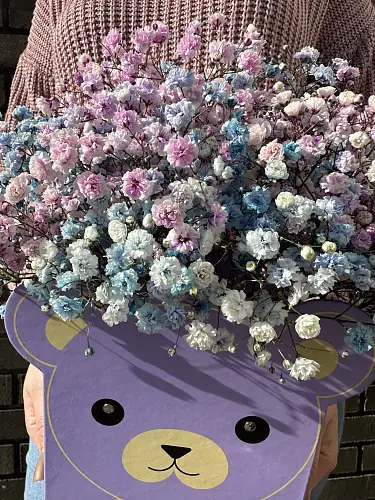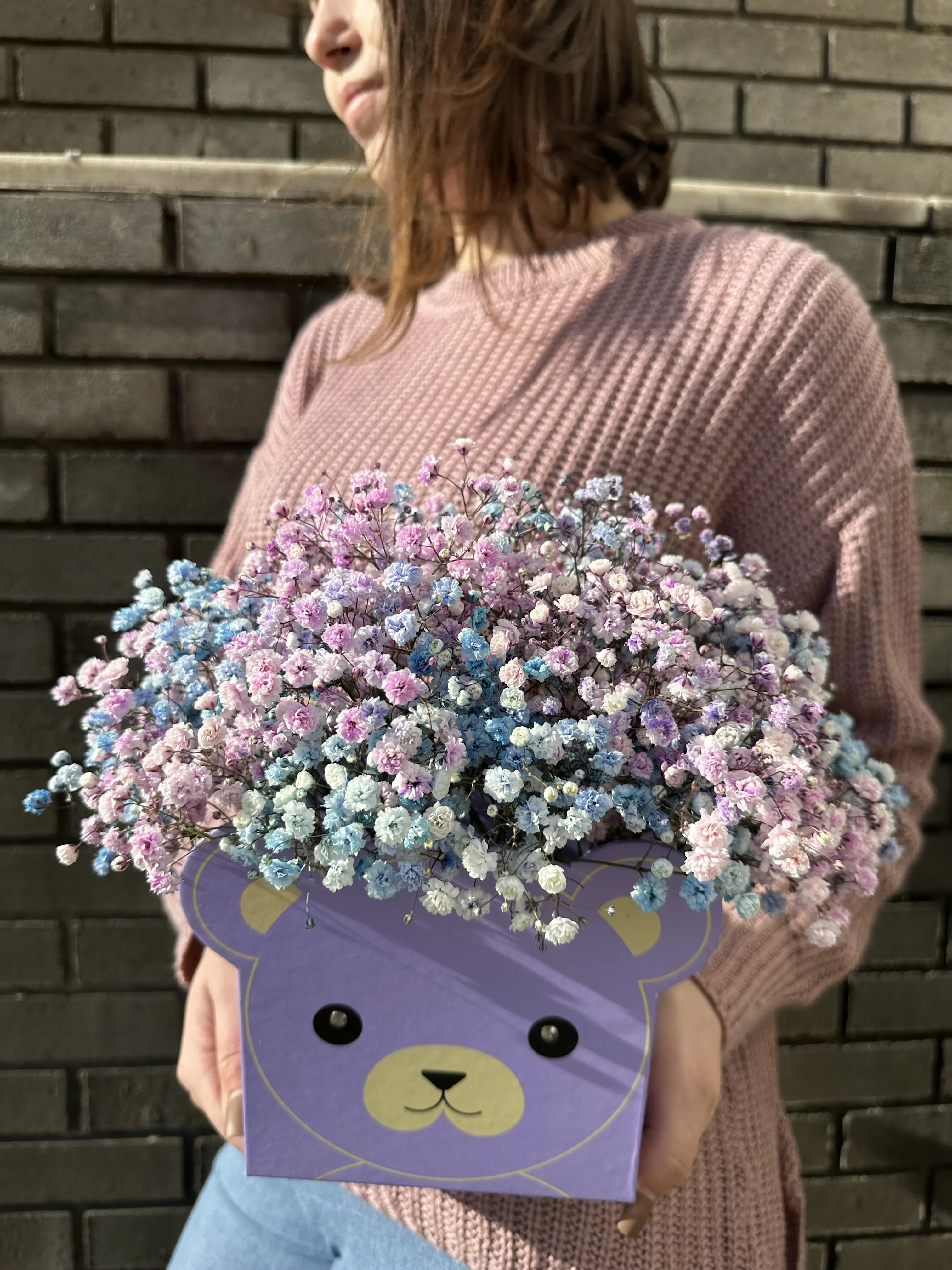 Букет живых цветов с радужной гипсофилой микс в сумочке нежного цвета