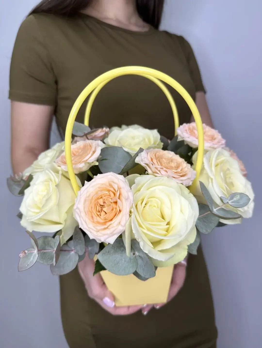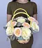Букет живых цветов с белоснежными розами в красивой нежной сумочке