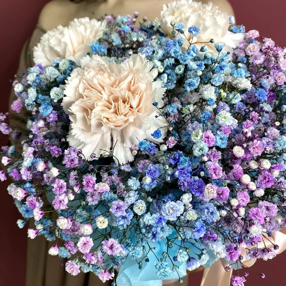 Букеты живых цветов с гвоздикой и гипсофилой в нежной шляпной коробке