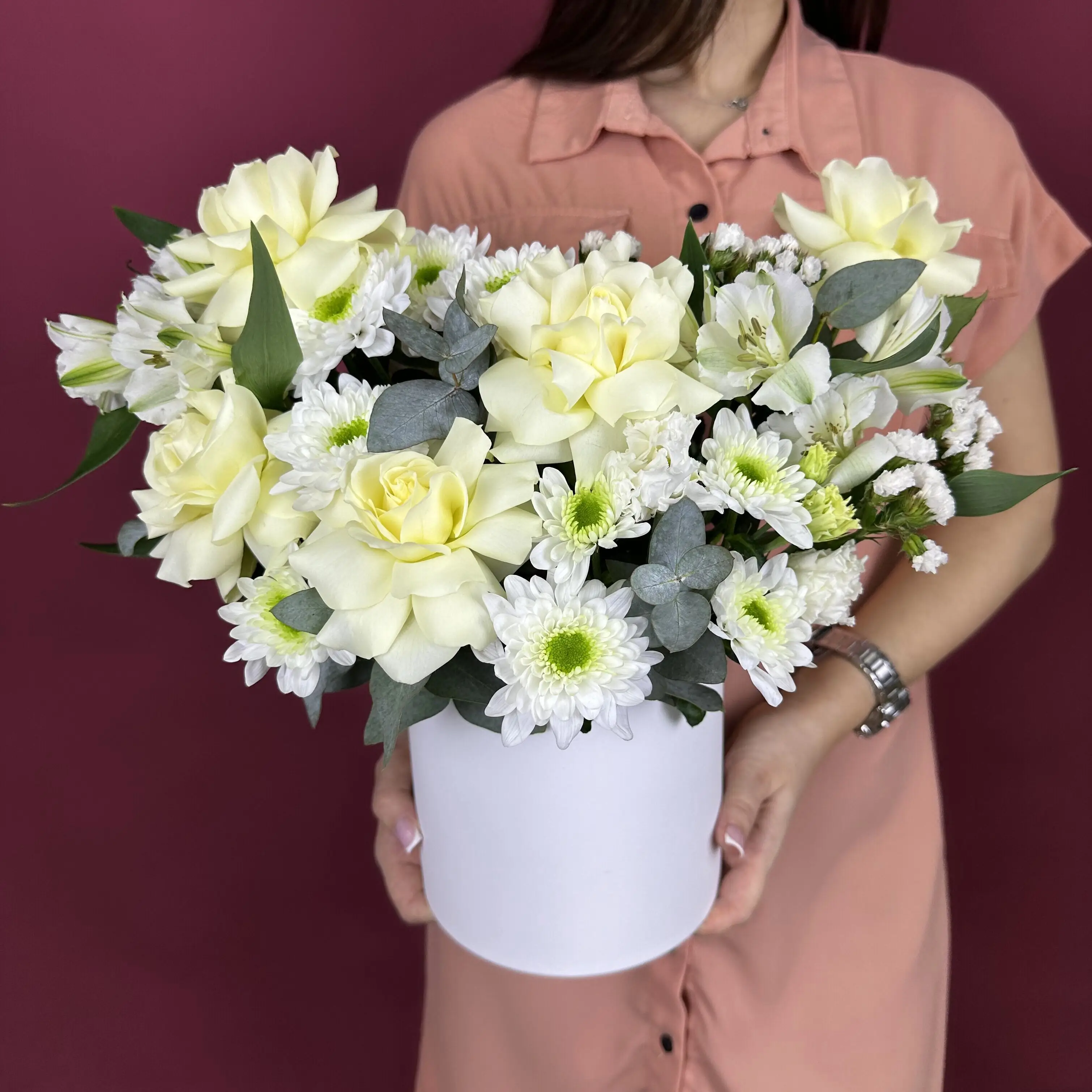 Букет с хризантемой и белыми французскими розами в нежной шляпной коробке