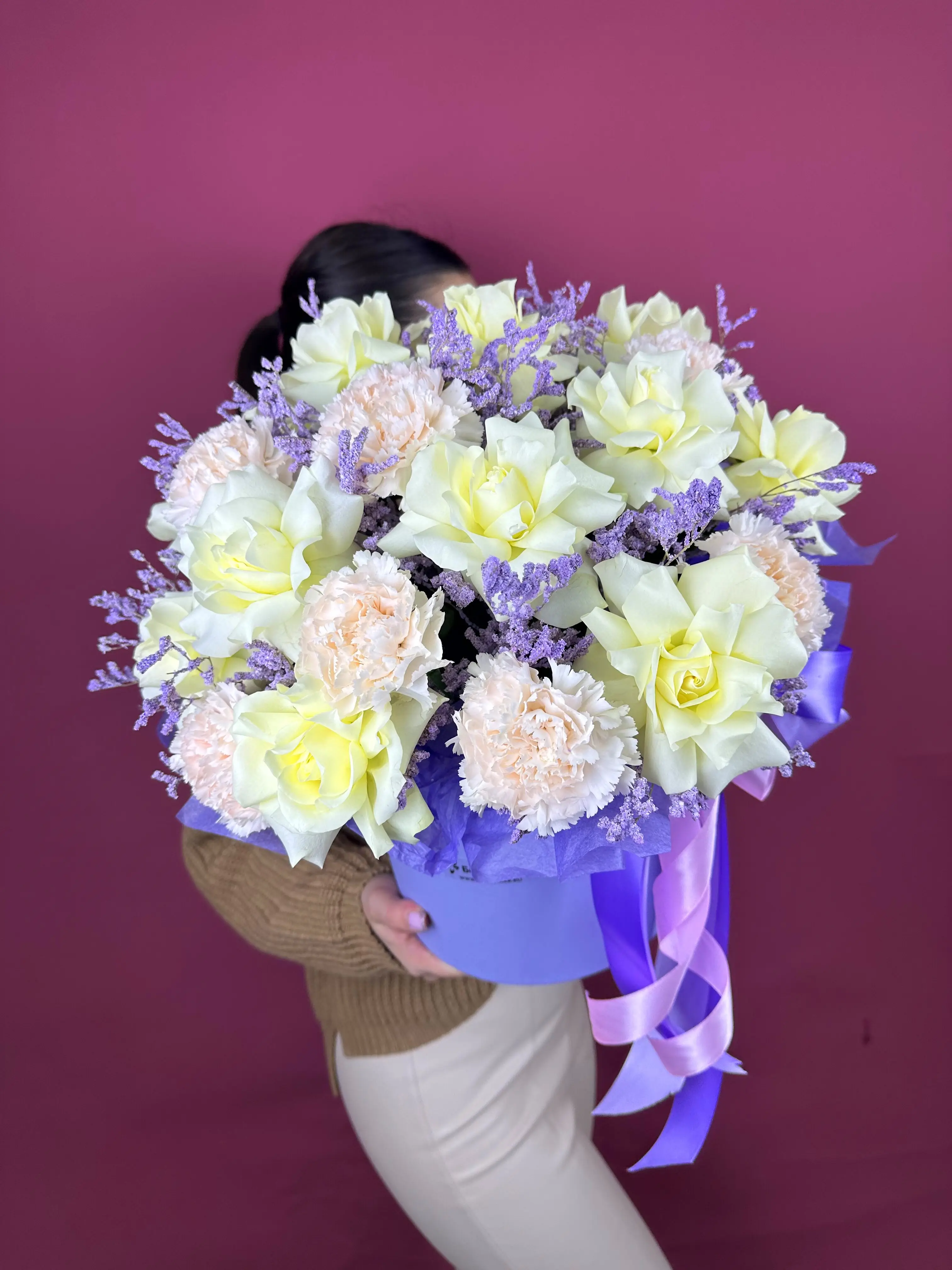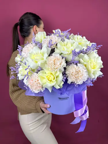 Букет живых цветов с французскими розами и гвоздикой в шляпной коробке